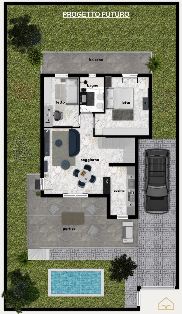 Il giardino perimetrale sui quattro lati regala privacy, luce e possibilità di realizzare una splendida piscina, creando un’oasi privata ideale per famiglie, animali domestici o per chi desidera vivere all’aperto in totale tranquillità.